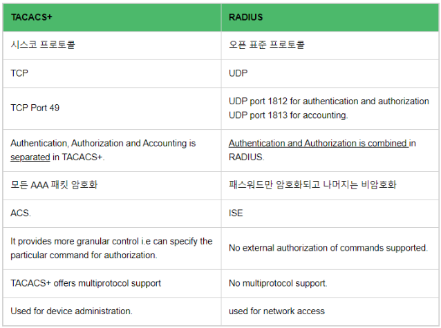 : Terminal Access Controller Access Control System 으로 시스코에 지원하는 프로토콜이며 Cisco Client와 Cisco ACS server간의 커뮤니케이션을 위해서 사용되고 있다. (Port 49를 이용)