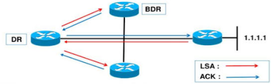 이 문제를 해결하기 위해 대표 라우터 DR을 선출하여, 모든 라우터들은, DR 라우터하고만 neighbor 관계를 성립하여 DR에게 LSA 광고를 실시한다. DR 라우터가 수신한 LSA 광고를 모든 라우터들에게 대표로 광고하고, DR에게만 LSAck를 수신하기 때문에 부하 현상이 발생되는 것을 방지할 수 있다.