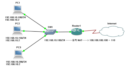 ▷ 내부 다수의 호스트들이 외부로 패킷을 전송할 경우 정해놓은 범위내의 IP주소로 변환